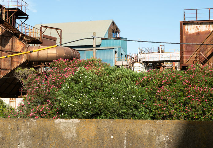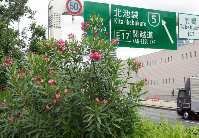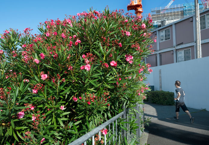 夾竹桃は夏の花である。 江戸時代中期、長崎経由で日本に伝来したと伝えられる。 樹木は乾燥や大気汚染に強く、街路樹や防火樹として利用される。 また、騒音や排気ガスの影響を抑え、砂埃の飛散防止の緩衝帯として活用できるため、 学校や公園の周りに植えられていることが多い。 公害地や被爆地では、他の樹木が枯死しても、夾竹桃はすぐに生育したと伝えられる。 夾竹桃にはオレアンドリンという有毒物質が含まれている。 花、葉、枝、根、果実すべての部分と、周辺の土壌、生木を燃した煙に毒性がある。 腐葉土にしても1年間は毒性が残る。 反面、夾竹桃の葉や樹皮の毒は薬品にも利用されている。 街路樹や防火樹に多いのは、葉の裏の気孔の開閉によって大気の浄化作用があるからだとされる。 昨今、夾竹桃の毒性を鑑み、撤去を求める声も多い。 昭和期建設の工場や学校、公園沿いに植樹されていることが多く、 建物老朽化での建替や事業見直しのための移転、立ち退きの際に伐採されることが多い。 時代の流れの中で、ポジティブにもネガティブにも捉えられてきたが、 夾竹桃は何も変わらずただそこにあり、咲いている。 夾竹桃は「人間的な植物」だ。私でありあなたでもある。